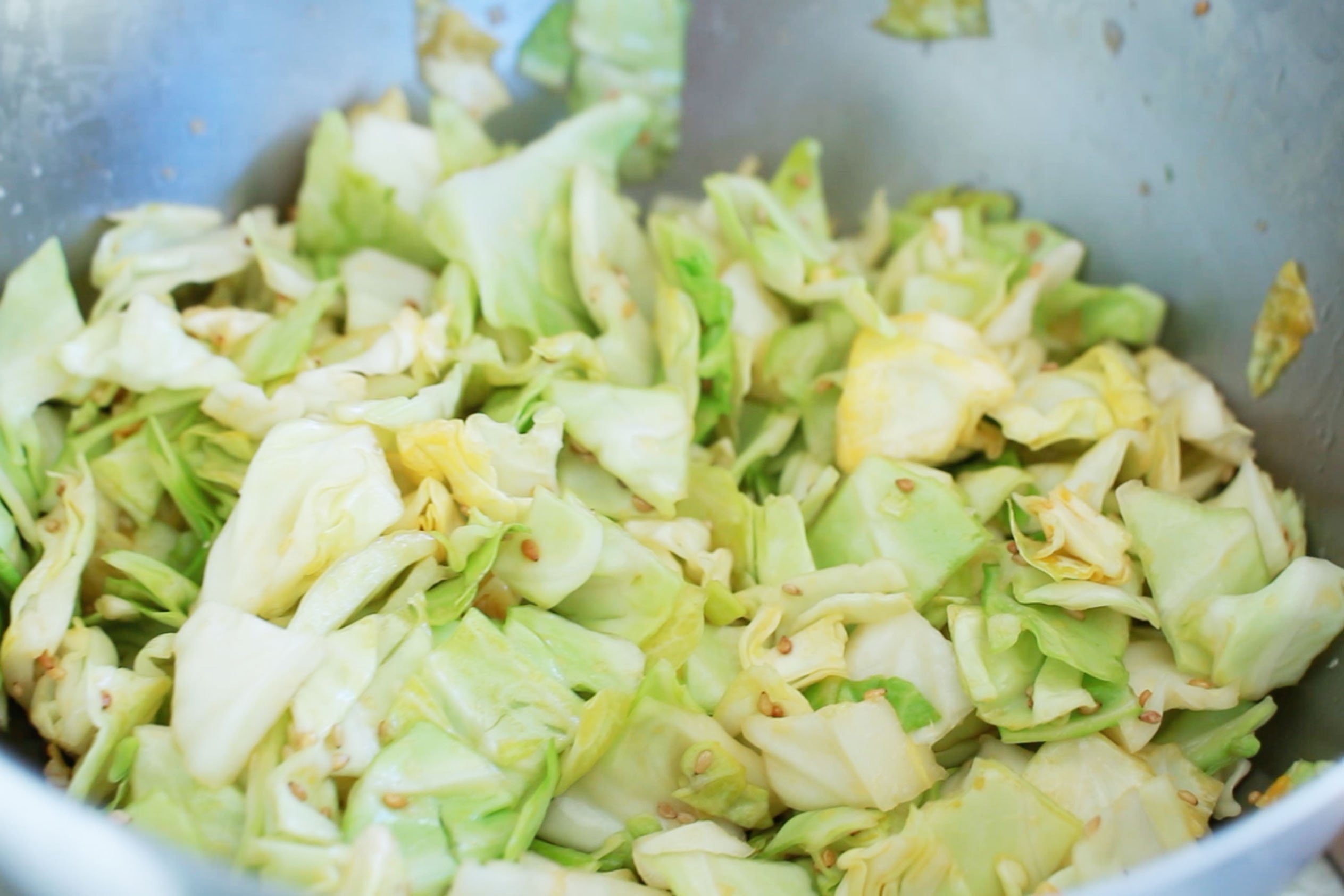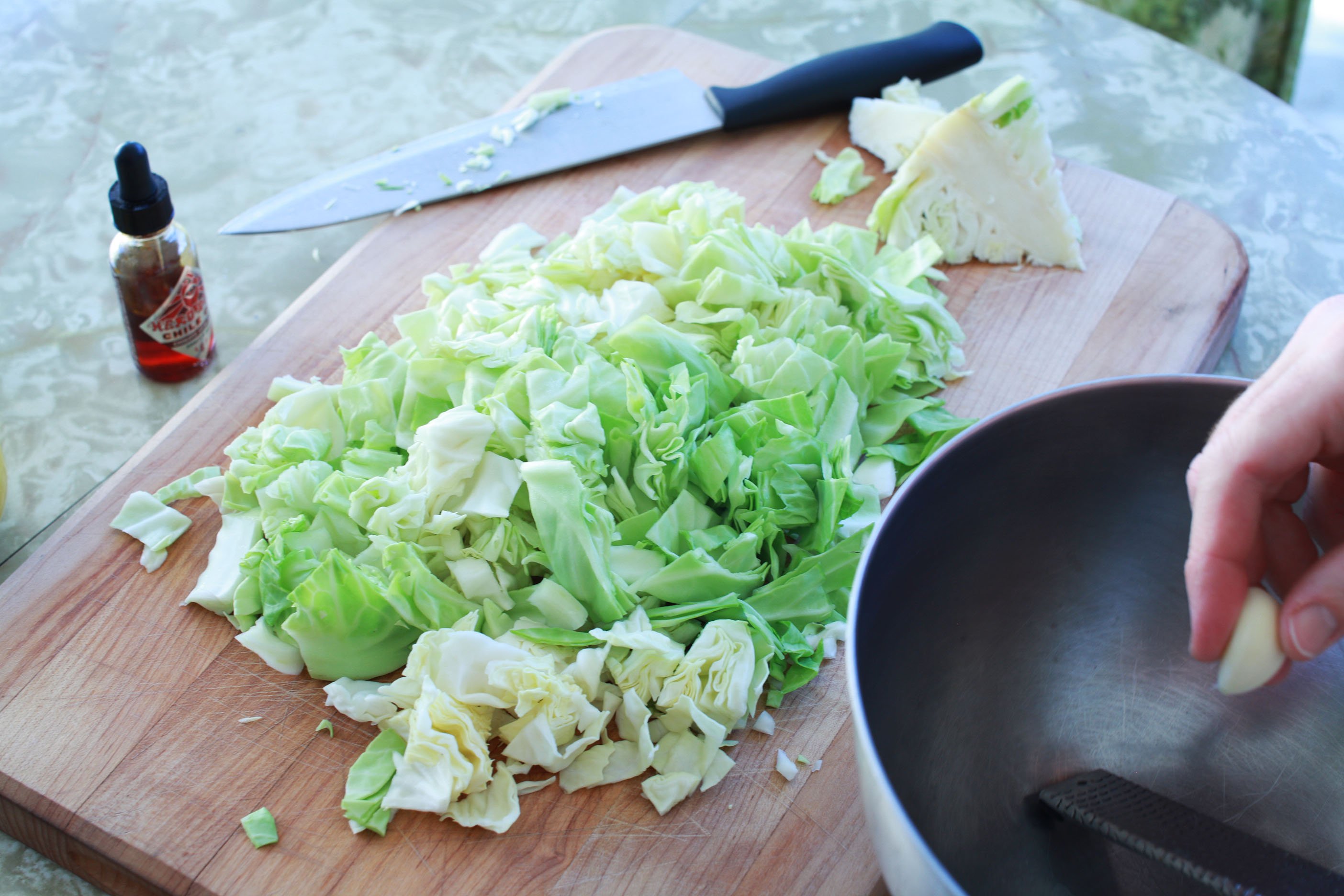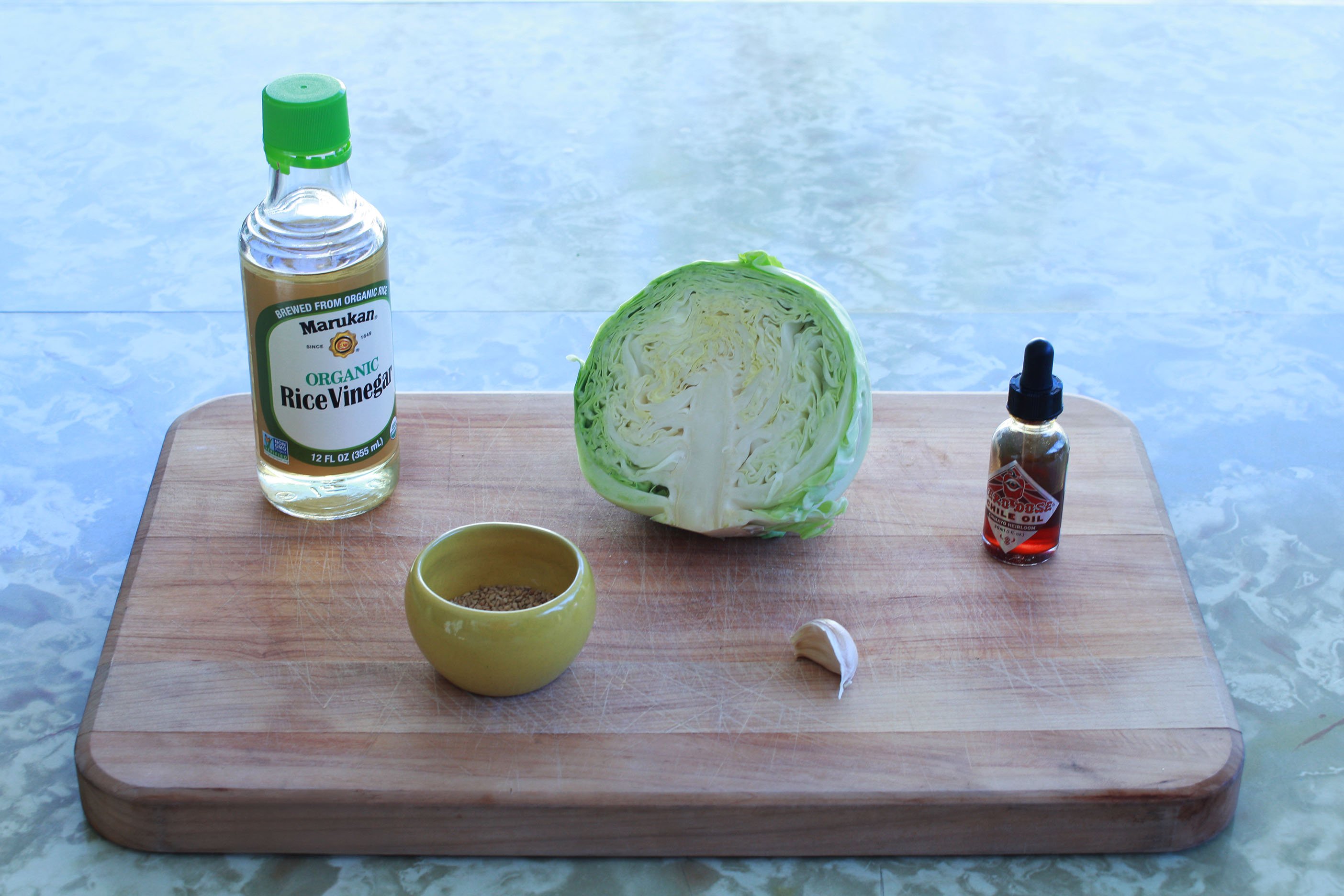 Whisk oil, vinegar, salt, and microplaned garlic. Chop cabbage into rough squares and toss with dressing and sesame seeds.