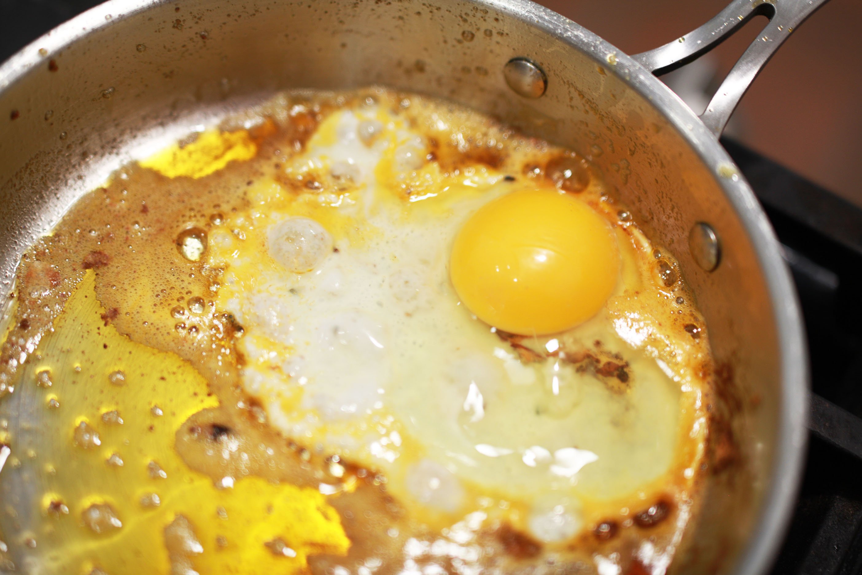Tilt pan and use a spoon to baste the top of the egg with the butter/Chile oil mixture.
