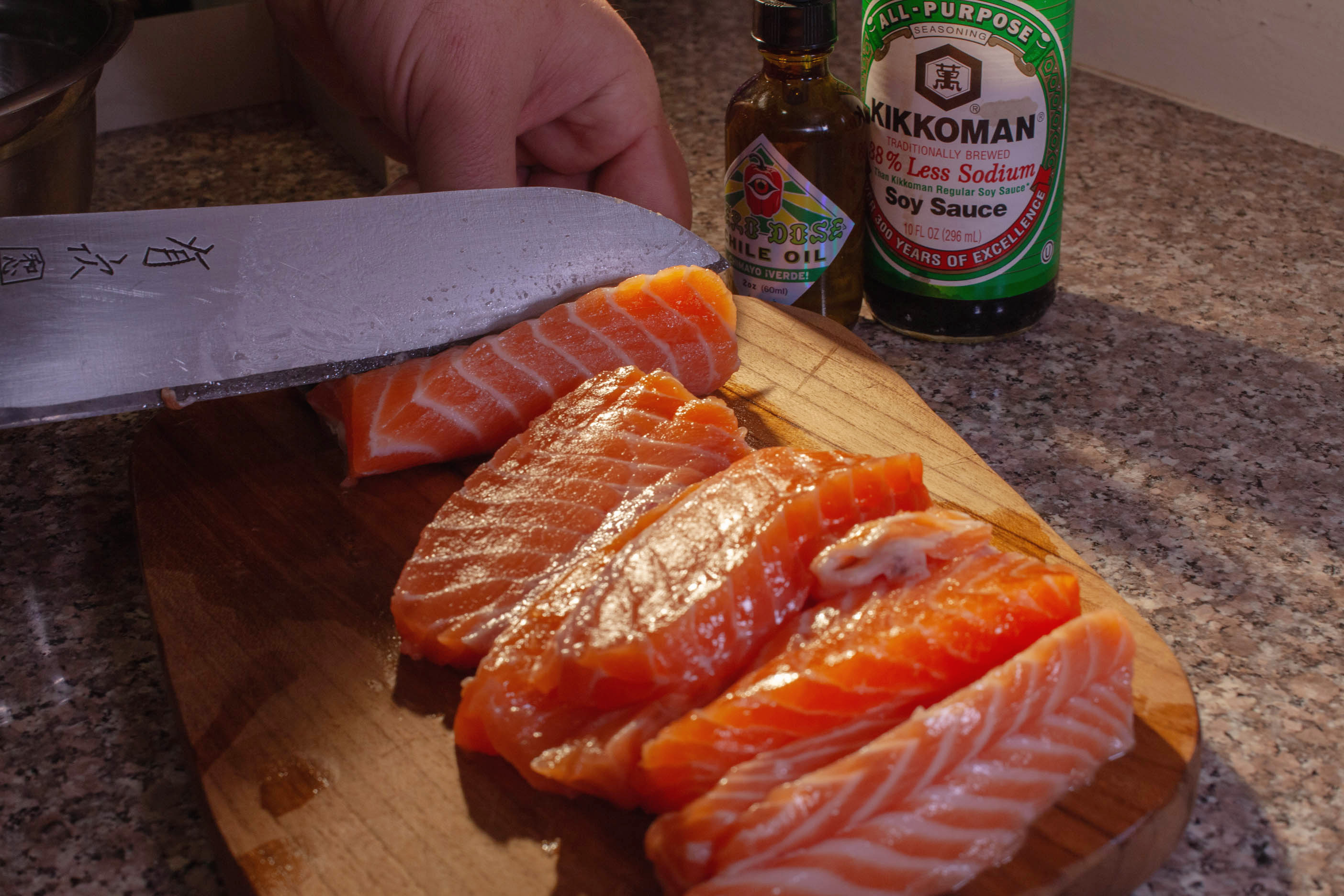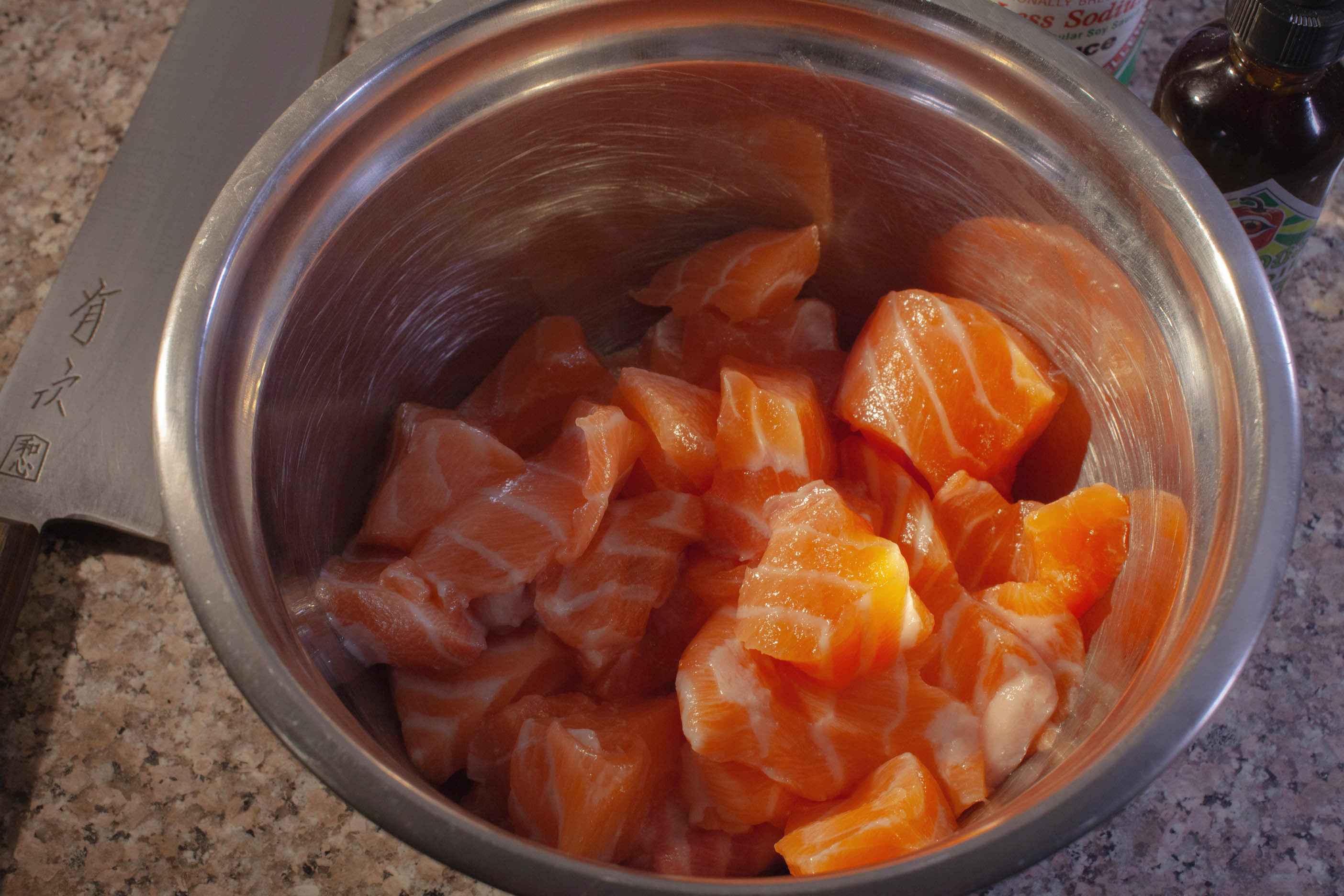 Obtain a fine cut of Sashimi Grade Salmon. Hero Dose collected this one from Dry Dock Fish Co. at Los Angeles area farmers market. Cut into approximately 1/2 inch cubes.