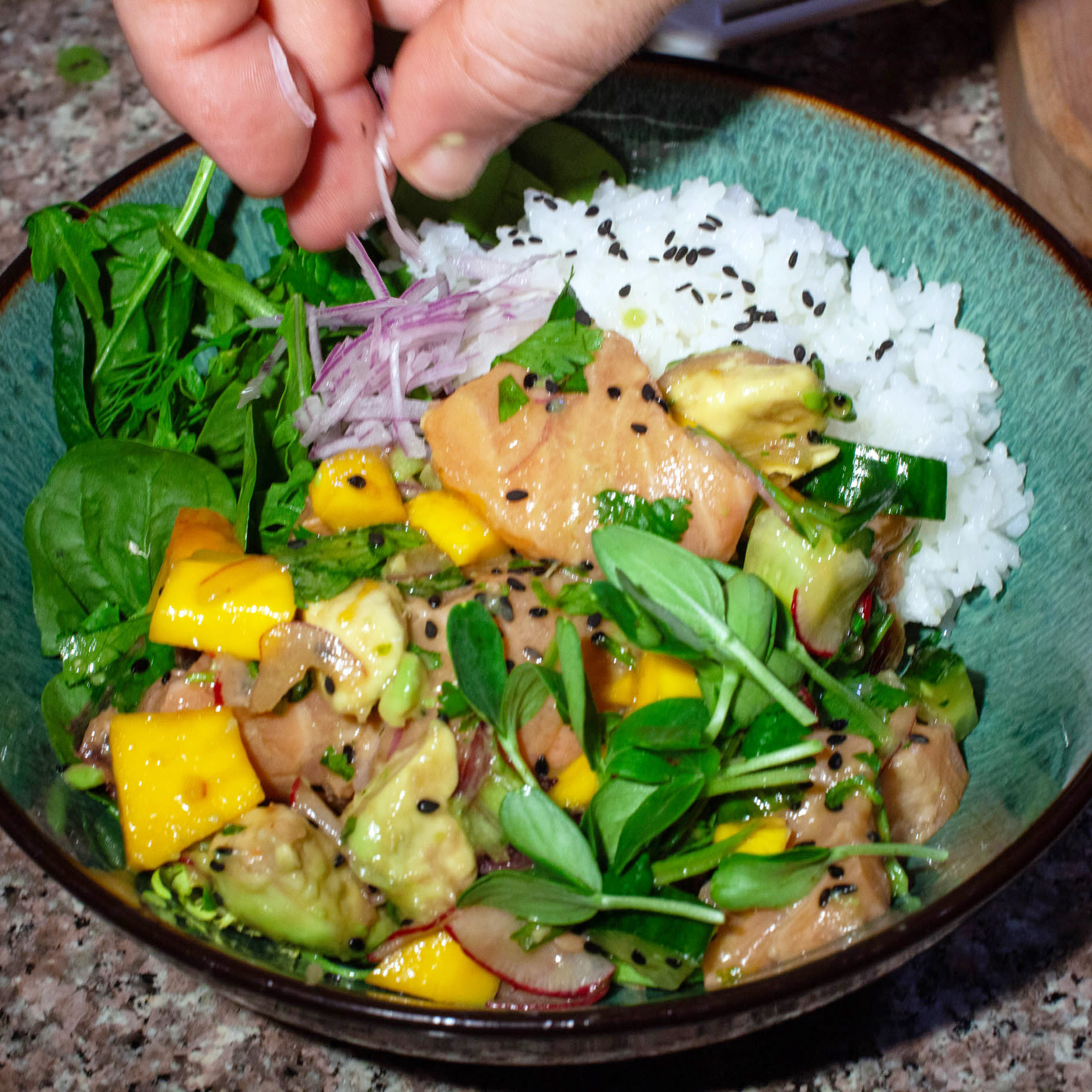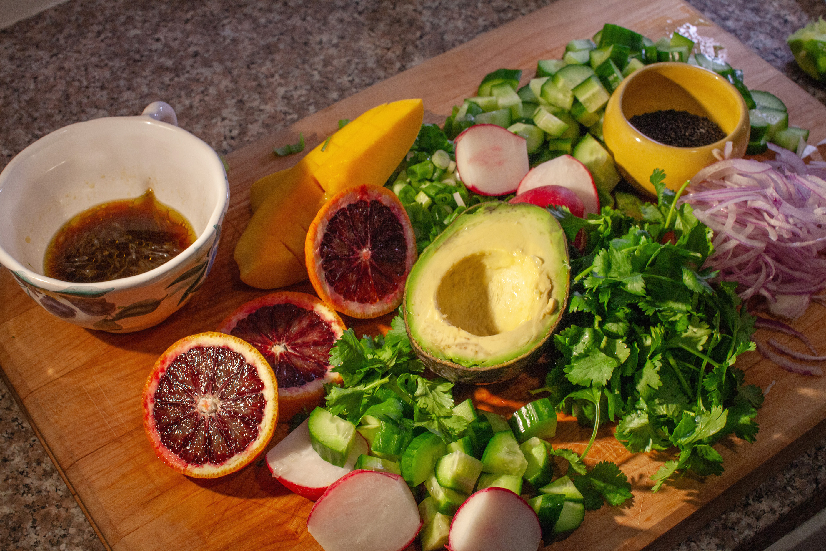 Optional: Diced cucumbers, radish, mango, green cantaloupe sprouts, and/or blood orange, to taste