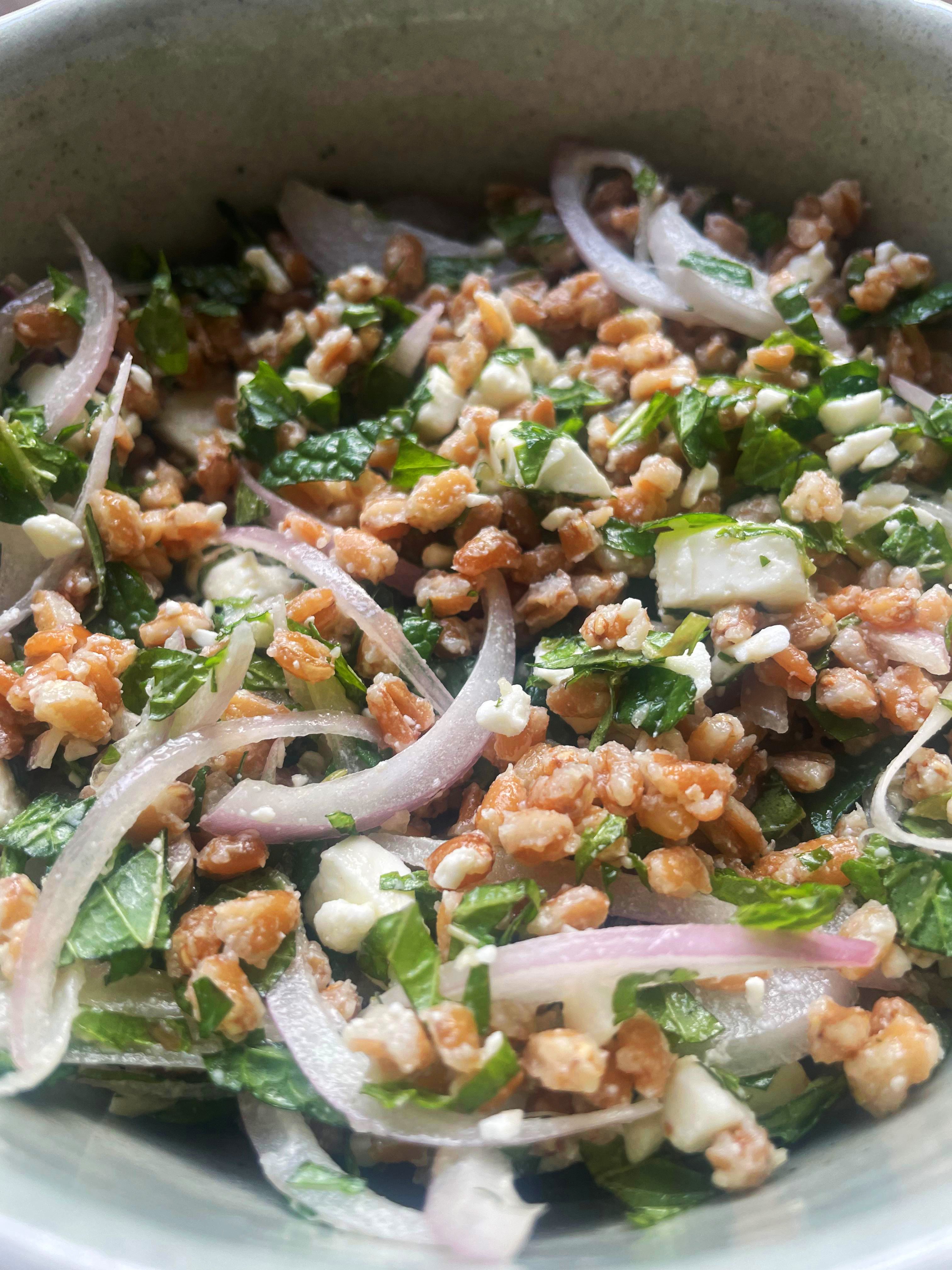 Combine farro, feta, sliced shallot, and mint in a large bowl and toss to combine. Whisk dressing until nicely emulsified. Pour dressing over salad and toss to combine. Salad will improve in a sealed container in the fridge overnight and then hold at peak power for about three days.